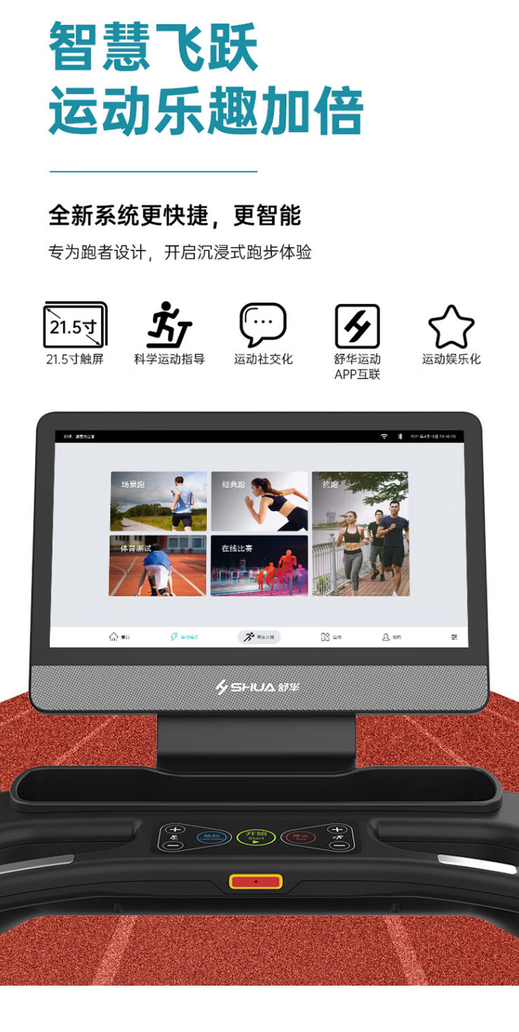 内置程序:搭载银河Galaxy跑步机系统3.0 :4种程式(5km 往返、间歇、登山、燃脂)+体育考试+倒计模式:时间/距离/ 卡路里+在线约跑+地图跑+银河Galaxy运动+应用软件