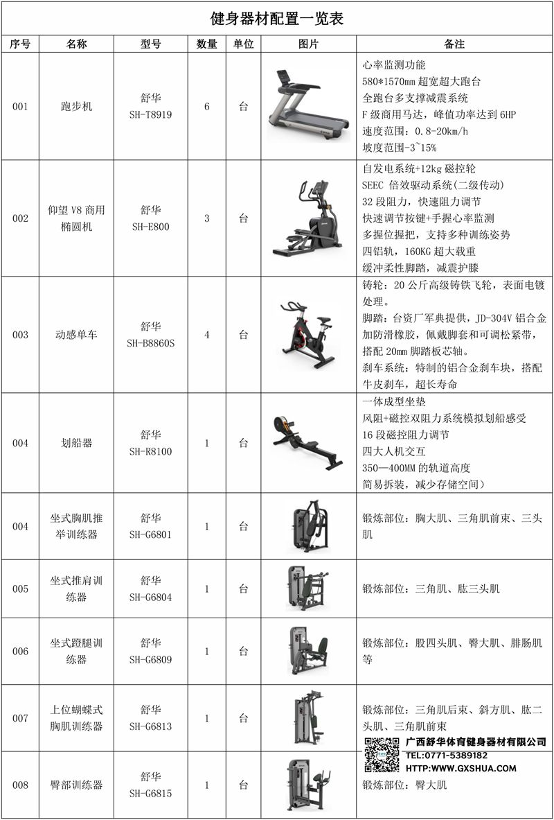 1.银河GalaxyV9智能跑步机SH-T8919*6台-独立仪表-简洁大气,全新外观设计,健康运动新选择;心率监测功能,可通过手握心率、无线心率带等不同方式实时采集心率数据;580*1570mm超宽超大跑台-跑感舒适,跑台整体安全稳定;全跑台多支撑减震平台,保证跑台超强支撑力,达到180kg支撑,满足专业健身房需求。F级商用马达-超强马达,AC 3.0HP 交流,峰值功率达到6HP,F级商用品质。速度范围达到0.8-20km/h;V9跑步机可实现跑台扬升功能,坡度范围-3~15%,满足客户不同的锻炼需求。