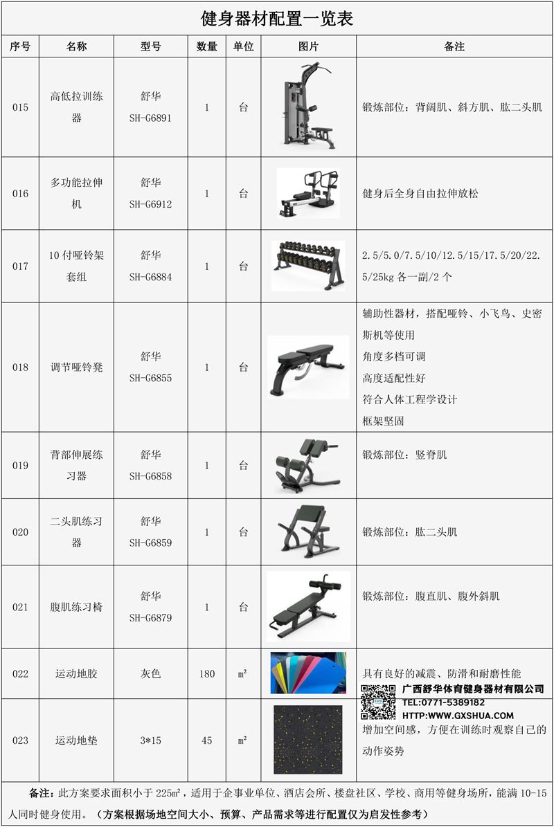 此方案要求面积小于225m²,适用于企事业单位、酒店会所、楼盘社区、学校、商用等健身场所,能满10-15人同时健身使用。(方案根据场地空间大小、预算、产品需求等进行配置仅为启发性参考)