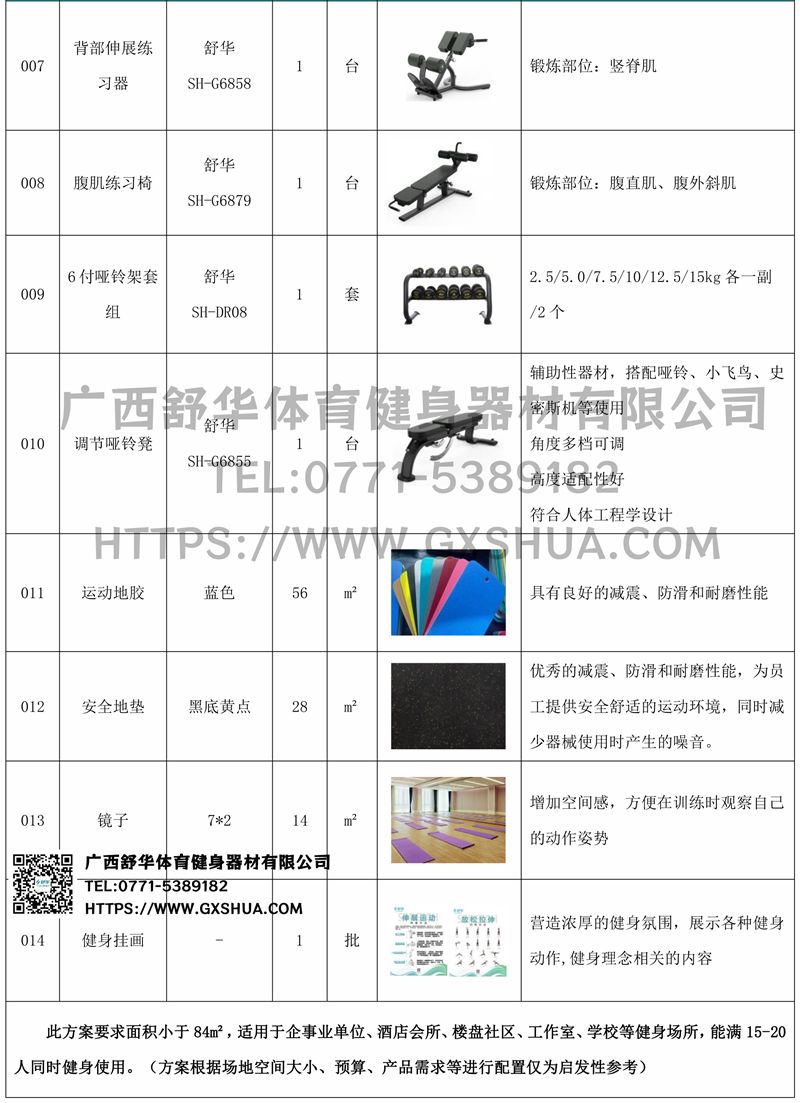 此方案要求面积小于84m²,适用于企事业单位、酒店会所、楼盘社区、工作室、学校等健身场所,能满15-20人同时健身使用。(方案根据场地空间大小、预算、产品需求等进行配置仅为启发性参考)