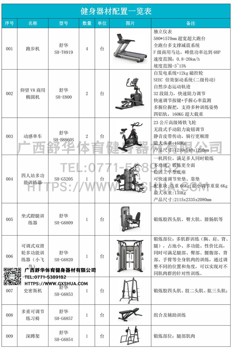 1.银河GalaxyV9跑步机SH-T8919*4台-独立仪表-简洁大气,全新外观设计,健康运动新选择;心率监测功能,可通过手握心率、无线心率带等不同方式实时采集心率数据;580*1570mm超宽超大跑台-跑感舒适,跑台整体安全稳定;全跑台多支撑减震平台,保证跑台超强支撑力,达到180kg支撑,满足专业健身房需求。