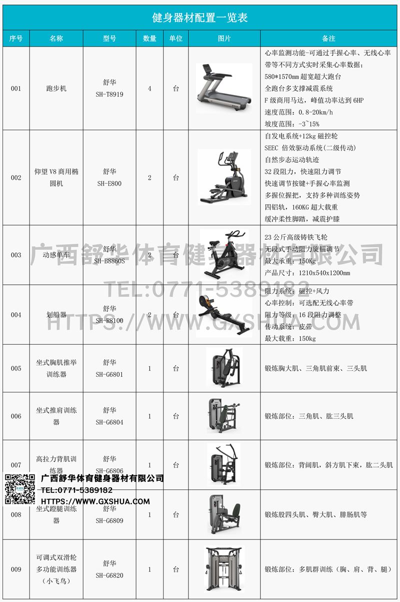 1.银河GalaxyV9跑步机SH-T8919*4台-580*1570mm超宽超大跑台,全跑台多支撑减震平台,保证跑台超强支撑力,达到180kg支撑,满足专业健身房需求。F级商用马达-超强马达,AC 3.0HP 交流,峰值功率达到6HP,F级商用品质。速度范围达到0.8-20km/h;V9跑步机可实现跑台扬升功能,坡度范围-3~15%,满足客户不同的锻炼需求。