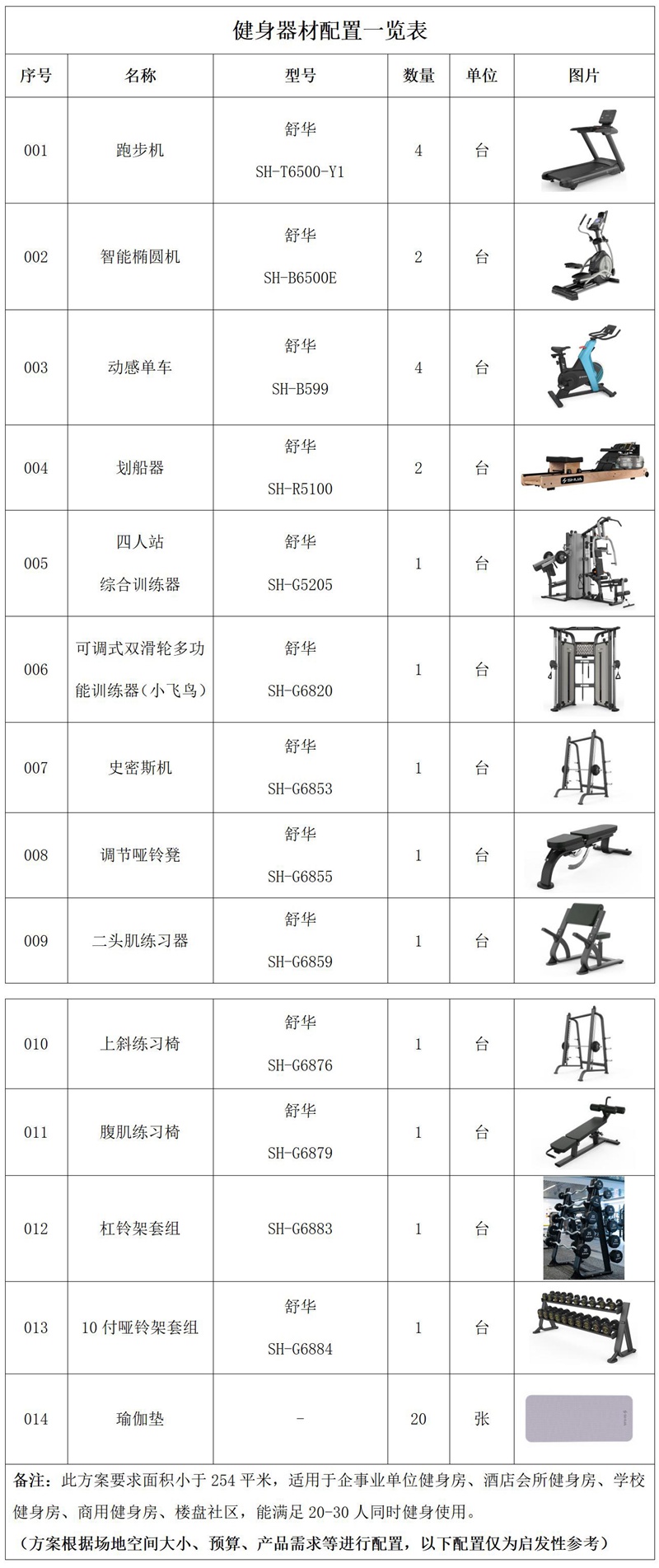 此方案要求面积小于254平米,适用于企事业单位健身房、酒店会所健身房、学校健身房、商用健身房、楼盘社区,能满足30-50人同时健身使用。(方案根据场地空间大小、预算、产品需求等进行配置,以下配置仅为启发性参考)